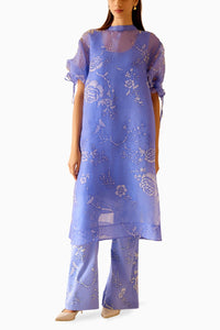 Introducing the Bia Tunic, crafted in our signature floral print for the season. This 100% printed silk organza tunic features sequined embroidery across the shoulders and sleeves, adding a touch of sparkle to a classic silhouette. It comes with a separate slip and a chic tie detail at the sleeves. Pair it with our printed cotton satin bell-bottom pants for a complete, stylish ensemble.