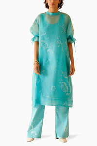Introducing the Bia Tunic, crafted in our signature floral print for the season. This 100% printed silk organza tunic features sequined embroidery across the shoulders and sleeves, adding a touch of sparkle to a classic silhouette. It comes with a separate slip and a chic tie detail at the sleeves. Pair it with our printed cotton satin bell-bottom pants for a complete, stylish ensemble.