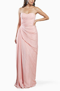 Introducing our enchanting baby pink gown, a true epitome of elegance and grace. This ethereal creation is designed with utmost care, ensuring every detail embodies sophistication and beauty. The gown features a captivating sweetheart neckline and the asymmetrical drape that gracefully cascades down the gown. The carefully crafted drapes on the torso create a mesmerizing visual effect.