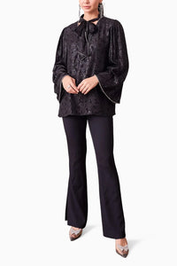 Elevate your winter look with this black georgette foil shirt, featuring a chic neck tie along with an embellished neckline for a blend of luxury and style.