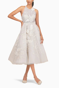 This midi dress is adorned with stunning 3D sequinned florals, creating a mesmerizing effect. Beaded detailing across the back enhances its ethereal beauty, adding a touch of sparkle and elegance to the flowing silhouette.