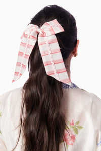 Elevate any ensemble with the Peony Ribbons bow, crafted from luxurious Chanderi silk adorned with charming pink stripes. Versatile and chic!