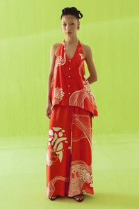 This bold red two-piece set features abstract white prints with flowing shapes. It includes a halter-neck sleeveless top with front buttons and an asymmetrical hem, paired with matching wide-leg pants.