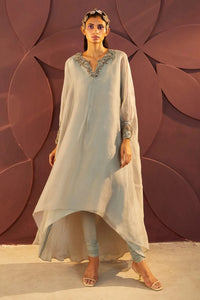 Bijou Kaftan Set an embroidered highlighted organza kaftan with embroidery on neckline and on the cuffs complemented with a lycra chooridar. Hand embroidery highlighting done with dabka and thread work the kaftan has full sleeves with cuffs and its half up half down silhouette.