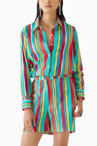 The Birch Shirt & Embroidered Shorts Co-ord crafted from our 100% cotton fabrication, trans-seasonal, is a statement piece. The shirt, made in our multi stripe painted Birch print, is part of a 2 piece set. With a hand embroidered sequin shorts, the shirt has a relaxed fit and has full sleeves. Featuring a summery look, it has gathers on the back. Paired with our Birch shorts with a front zipper, it looks chic. Wear it with heels for an elegant look.ÂÂÂ