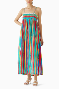 The Birch Strappy Dress crafted from our 100% cotton fabrication, trans-seasonal, is a statement piece. The dress, made in our multi stripe painted Birch print, is lined. With pintucked yoke, the dress has a relaxed fit and straps. Featuring a summery look, it has pintucks on the back as well. Wear it with heels for an elegant look.Â