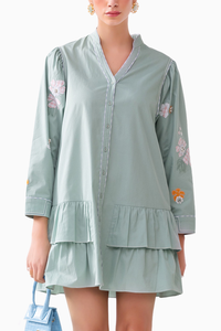 Introducing the Birdsong Embroidered Cotton Dress in a serene sea foam color—a delightful blend of charm and comfort. This dress features hand-embroidered appliqué flowers on the sleeves, complemented by check piping details and stitch lines on the placket. The layered frills at the bottom add a feminine touch, while the band collar with button closure ensures easy wear. With a relaxed fit, this dress is perfect for any occasion, bringing a playful elegance to your wardrobe!