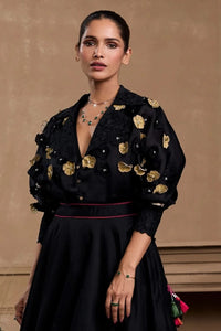 This black silk organza kimono shirt is a statement piece that blends luxury with intricate artistry. Featuring 3D floral appliqué, the shirt creates a striking texture that adds depth and dimension to the delicate silk organza fabric. The kimono-inspired design offers a relaxed, flowy silhouette, making it both elegant and comfortable. The black hue provides a timeless and versatile base, while the 3D floral appliqué elevates the overall aesthetic, making it ideal for evening wear, formal gatherings, or special occasions where sophistication and style are key.