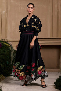 This exquisite ensemble combines a black silk organza 3D floral appliqué kimono shirt with a black Chanderi floral appliqué and cutwork skirt, creating a perfect blend of modern luxury and traditional artistry. The kimono shirt, crafted from delicate silk organza, features stunning 3D floral appliqué, adding texture and depth to the airy fabric. Paired with the black Chanderi skirt, adorned with intricate floral appliqué and cutwork, this look exudes elegance and sophistication.