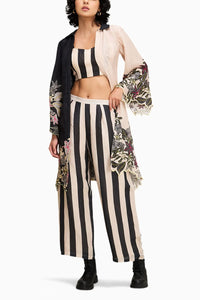 The Black Ahyana Printed Bustier and Pants feature vibrant prints and delicate embroidery, offering a bold yet sophisticated look. It is paired with an embellished jacket in linen slub, adding a layer of refinement and elegance to this modern and stylish ensemble, perfect for chic, statement-making occasions.
