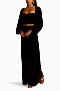 Featuring the Black Aladdin Velvet Dress by Decastro Moda. Crafted from the finest silk velvet, this dress exudes sophistication with its understated deep neckline and timeless Aladdin sleeves. Dramatic details like a cinched waist and deep slits make it perfect for unforgettable evenings.