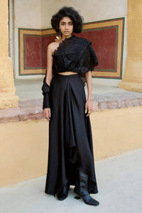Featuring Black Alaya Top with Signature Skirt by Ritika Arya Jain's RAYA collection, a sculptural off-shoulder top with pleated textures paired with the fluid drape of the signature skirt, blending structure and elegance seamlessly.