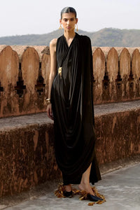 Featuring Black Amira Dress by Ritika Arya Jain's RAYA collection, a draped black dress sculpted in soft fluidity, cinched with a statement brooch. Its cascading folds add quiet drama to a refined, minimalist silhouette, exuding modern elegance.