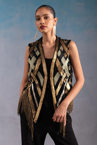 Featuring a multi-dimensional web pattern of zari, bugle beads, and fish-scale sequins arranged in crossing lines, this piece is further enhanced with mixed bead tassels that add drama and movement to the silhouette.