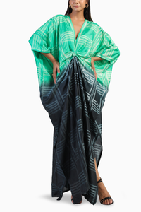 Featuring the Black and Green Ombre Shibori Kaftan, this stunning piece is designed to impress. The kaftan showcases a gorgeous v-neckline and a central front knot, adding a sophisticated touch to its elegant silhouette. The ombre effect, transitioning seamlessly from black to green, creates a visually striking design. Perfect for any special occasion, this kaftan combines timeless style with a modern twist, ensuring you look effortlessly chic.