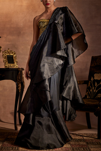 Featuring Black and Grey drape saree on georgette fabric with organza frills, the corset blouse is embelished with scatiered sequin and golde chain.