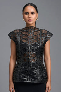 Featuring a sculpted, architectural silhouette, this top is defined by intricate lattice cutwork, structured shoulders, and a sharply cinched fit for a bold, modern statement.
