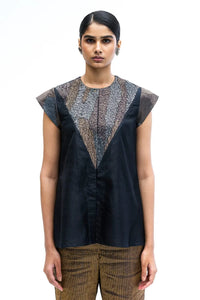 Handwoven silk shirt featuring fragments of metallic textures in the yoke and sleeves.