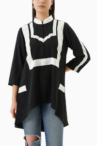 Graceful and modern, this tunic comes from the latest collection by Shivya K. Diagonal lines at the neck in white and hem lend a directional edge to the flowing silhouette. Crafted in twill georgette makes this tunic particularly comfortable to wear. Mirror the label's styling by layering it over slim-fitting pants.