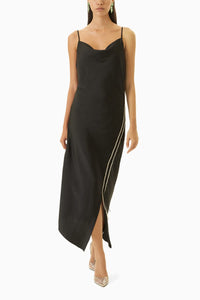 Featuring Black Aurora Cami Satin drape dress. It has soft cowl neck with thin shoulder strap. Chain detailing on bottom left side of wearer and side seam conceal zipper.