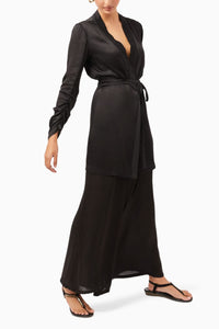 Featuring Aurora Set by Contemponari. This exquisite Modal Satin robe set in black features an intricately embroidered lapel and a drawstring at the waist. Taking your loungewear game up a notch, this co-ord set comes with ruched sleeves that further enhance the look of this ensemble. Redefining comfort, elegance and style, this loungewear robe set boasts of free size pants designed to make you feel pampered at all times.