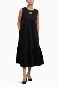 Chic and timeless, the Black Frill Long Dress offers a relaxed fit with a sleeveless silhouette for effortless style. The dropped waist frill adds graceful movement, while a striking black diamond heart brooch provides a touch of bold elegance.