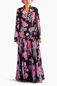 Featuring a black printed blazer with side knots and embroidered neck line, it comes along the flared sharara.