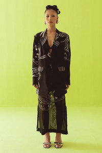 A statement black co-ord set featuring fluid white sketches, layered with a sheer printed skirt. The oversized blazer adds structure, while peekaboo layering brings a bold, contemporary edge.