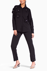 Featuring the Black Bloom Co-ord Set by House of Zeniaa. Effortlessly stunning with 3D embellished flowers on the shirt front and sleeves, ensuring you stand out. Paired with straight-fit pants in the same color and silver pumps, it's a head-turning ensemble. Soft crepe composition, black hue, and regular fit.