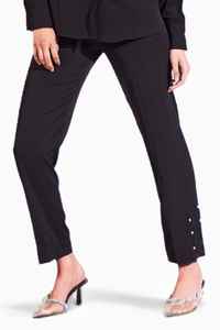 Featuring the Black Bloom Pants by House of Zeniaa. Effortlessly stunning with stone embellishments at the hem, side zipper opening, and pockets on both sides. Crafted from soft crepe fabric, offering a regular fit for versatile comfort and style.
