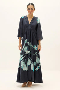 A fluid maxi dress in handwoven cotton mul, printed with oversized hibiscus motifs in soft aqua tones against a deep charcoal base. Featuring a gathered V-neckline, wide sleeves, and a graceful flared hem, it drapes effortlessly for a look that’s both relaxed and refined.