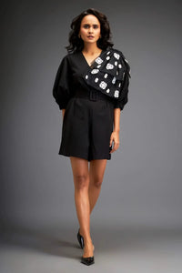 Featuring playsuit with bold floral applique detailing on voluminous sleeves.