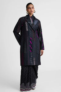 This is a patchwork Bandhani on silk long jacket, perfect to be clubbed with sarees as an outerwear. Alternatively, they can be styled with tailored trousers along with crop or tank tops.