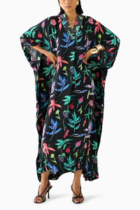 The Black Botanica Kaftan crafted from our stunning vegan silk fabrication, trans-seasonal, is a statement piece. This Kaftan, digitally printed in our hand drawn Botanica floral print has a relaxed fit. With kimono sleeves , the piece has top-stitching on the neck and is Free Size. Featuring a formal look, it is antifit.