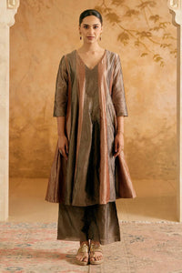 The Black Bronze Crush Tissue Anarkali with Narrow Pants is a stunning masterpiece of design and craftsmanship. The kurta, made from premium crush tissue fabric, features a unique black bronze finish that shimmers with every movement. Fully lined for comfort and a structured fit, it drapes effortlessly. Paired with tailored narrow pants in a soft, complementary fabric, this ensemble balances the voluminous Anarkali with a sleek, modern touch, making it a must-have for any special occasion.