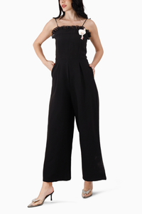 A bustier style Jumpsuit with lace detailing and noodle straps . The Yoke is fitted till the upper waist which falls into semi-wide leg trousers. Side pockets are added for convenience.