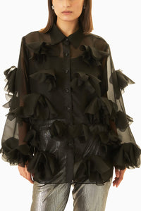 This black fluid organza top features delicate embroidered flowers, offering a perfect blend of lightness and elegance. Its graceful design adds a touch of femininity, making it a stunning choice for both casual and formal occasions.