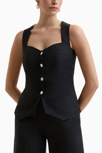 Tailored with lightweight linen, the Capri waistcoat features false welt pockets and a shell button fastening on the front. The construction recalls the design of a tailored-cut gilet with modern refinement.