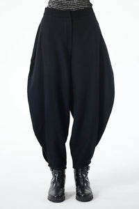 Sculpted trousers, with a take on balloon silhoutte with bold pleats. Made in handwoven woollen felt, the silhouette holds a good structure while giving good flow to the form.