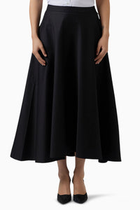 Elegant and versatile, this flared up and down falred black cascade skirt is crafted in pima cotton blend that offers a gentle sheen and fluid drape designed with a flattering high-waist silhouette and a smooth side zip closure, it moves effortlessly with every step. A timeless piece that pairs seamlessly with both structured tops and relaxed blouses, making it a wardrobe essential for day-to-evening dressing.