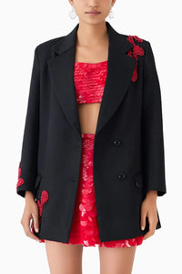The Cherry Blazer crafted from our stunning cotton suiting fabrication, trans-seasonal, is a statement piece. The piece, lined suiting , has a straight. The blazer has been embroidered with cherry blossom like flowers. It has a lapel and collar. It can be worn with our ruby sequin bustier and skirt. Wear it with heels for an elegant look