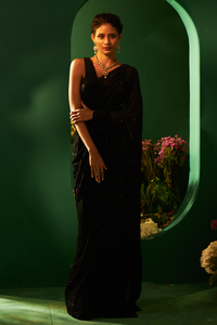 Featuring a black saree in chiffon base with laser cut daana work. The set is crafted with the finest materials and will accentuate the look.