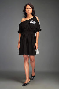Featuring Black Colorblock Off-Shoulder Dress by Deepika Aroras Into The Wild Collection, this color-blocked mini dress showcases an elasticated waist, puff sleeves, asymmetric cut, and metallic embellishments for a bold, stylish look.