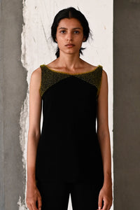 Featuring Black Contoured Comfort Top by Somya Goyal's Comfort Zone Collection, this sleeveless top has front and back hand-textured green PVC cord detailing, a broad neck, and a sleek silhouette, blending comfort with bold, artistic design.