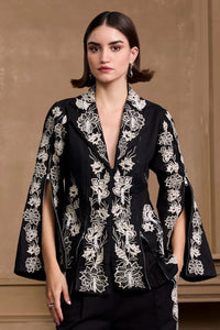 This black cotton twill flared jacket is a bold and contemporary piece, featuring contrast appliqué, threadwork, and beadwork that add intricate texture and visual interest. The zipper detail gives it a modern edge, while the flared silhouette creates a flattering, dynamic shape. Crafted from durable cotton twill, the jacket offers both comfort and structure, making it a versatile addition to any wardrobe.