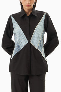 This black cotton three-panel denim shirt is a bold reinterpretation of a classic silhouette. Featuring a structured panel design, it is embellished with shimmering crystal lines and delicate chitta detailing, adding a touch of luxe to its rugged charm. A standout piece that merges utility with understated glamour.