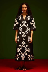 Featuring a black cotton poplin maxi dress with intricate ivory sitara thread embroidery, this relaxed-fit piece combines timeless elegance with comfort for an effortlessly chic look.