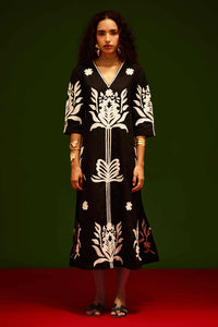Featuring a black cotton poplin maxi dress with elegant ivory tulip thread embroidery, this relaxed-fit design offers a timeless silhouette with detailing and comfort.