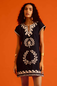 Featuring a black cotton shift dress with ivory wave thread embroidery, this relaxed-fit piece is crafted from cotton poplin, offering a sleek silhouette with subtle, flowing detailing for effortless elegance.