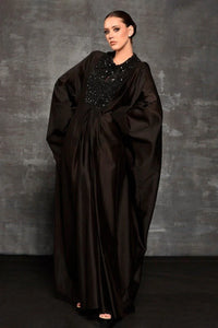 A sleek black kaftan dress crafted in cotton silk, designed with an easy silhouette that drapes beautifully. Understated yet elevated, it’s ideal for festive occasions and contemporary evening dressing.